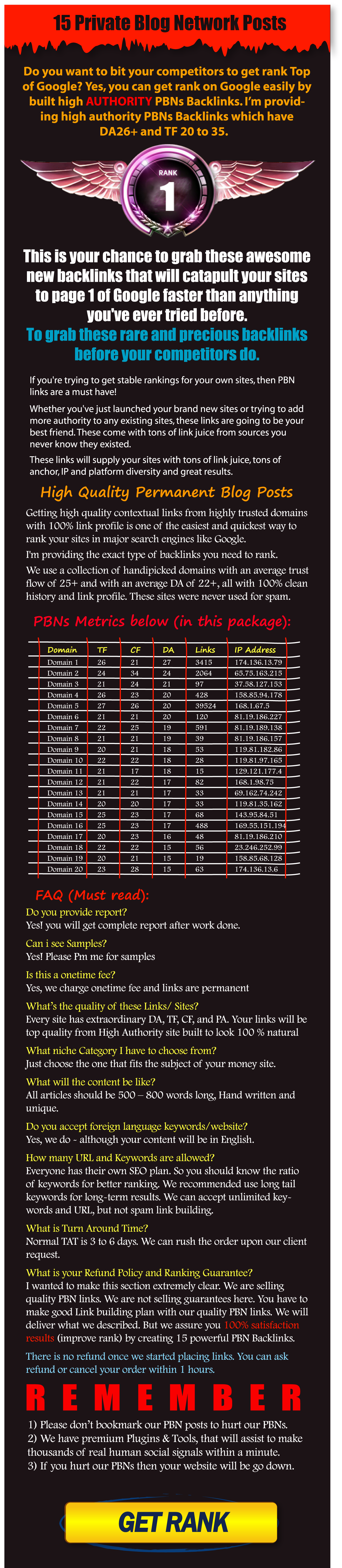 Welcome to our brand new PBN service - High Authority for the first time EVER on SEOClerks. In this package you will get 15 high authority permanent PBN backlinks from 15 permanent PBN posts, which have DA27+ and TF27+.